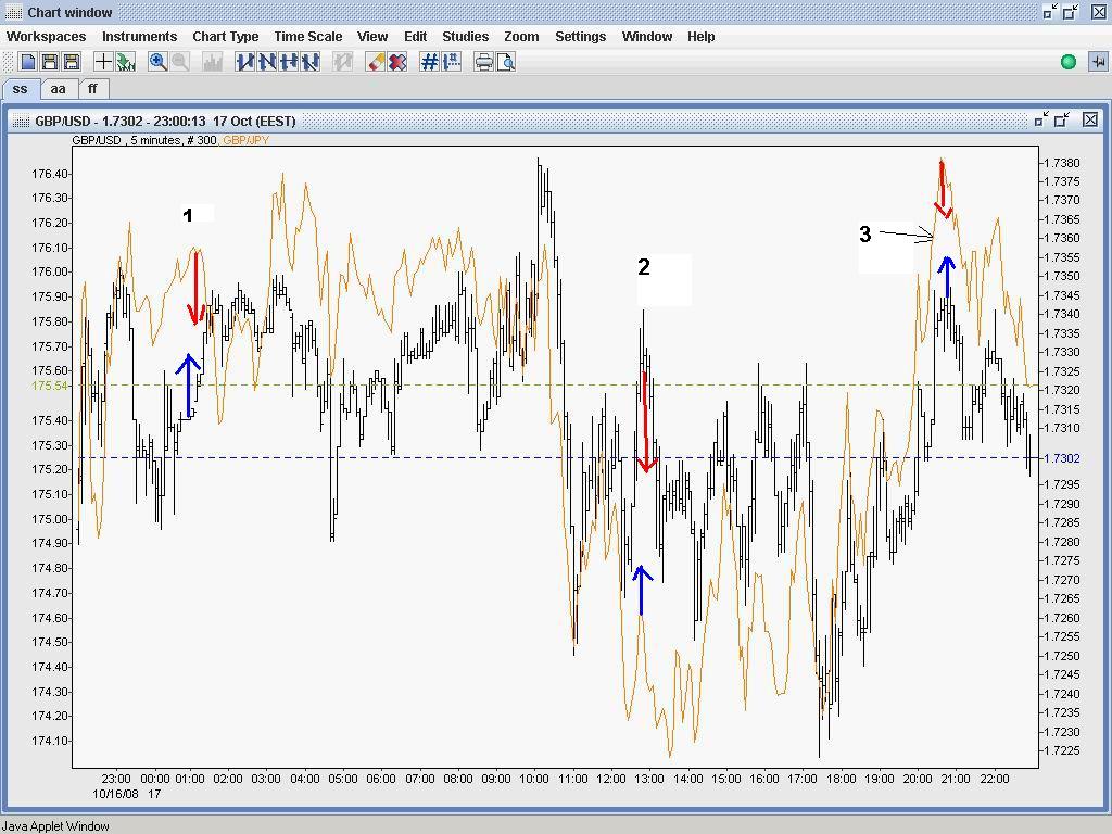 La momentul 1 luam short (rosu) GBP/JPY si long (albastru) GBP/USD.La momentul 2 cand e clar ca suntem in profit inchidem ambele pozitii odata si luam short (rosu) GBP/USD si long (albastru) GBP/JPY pana la momentul 3 cand o luam de la capat.Avantajul strategiei ar fi ca ca stim "sigur" ca la un momentdat o sa fim in profit iar eventualel pierderi sunt limitate de corelarea perechilor.A inteles cineva ceva ? :P