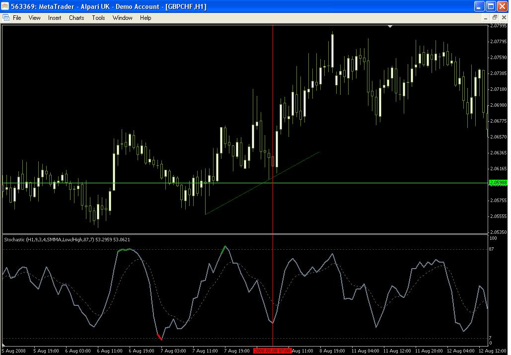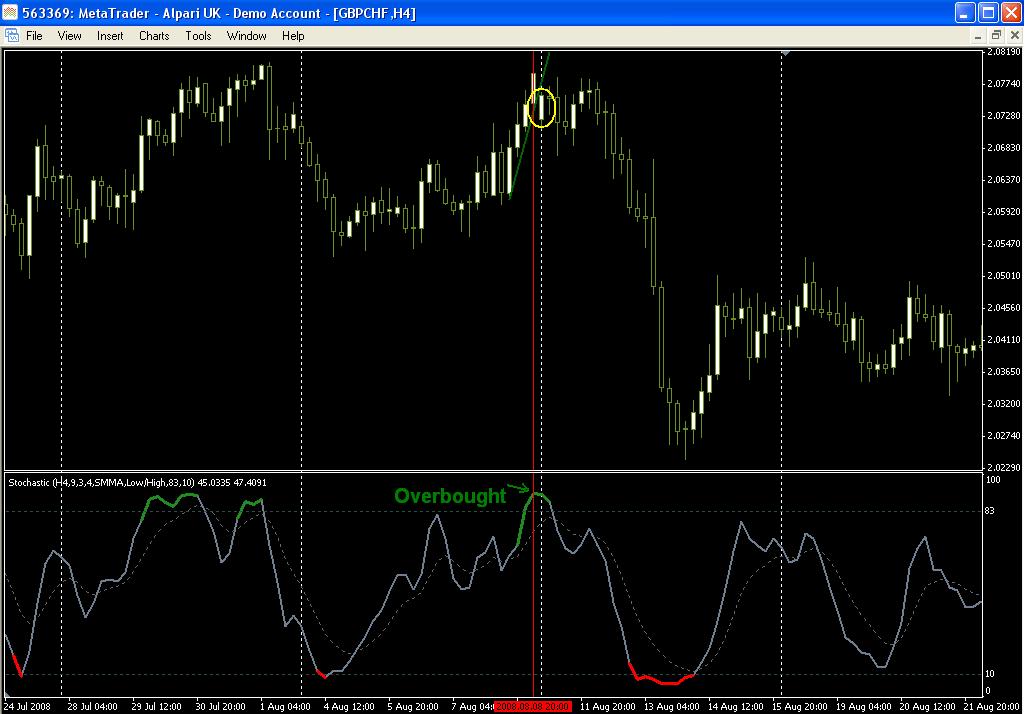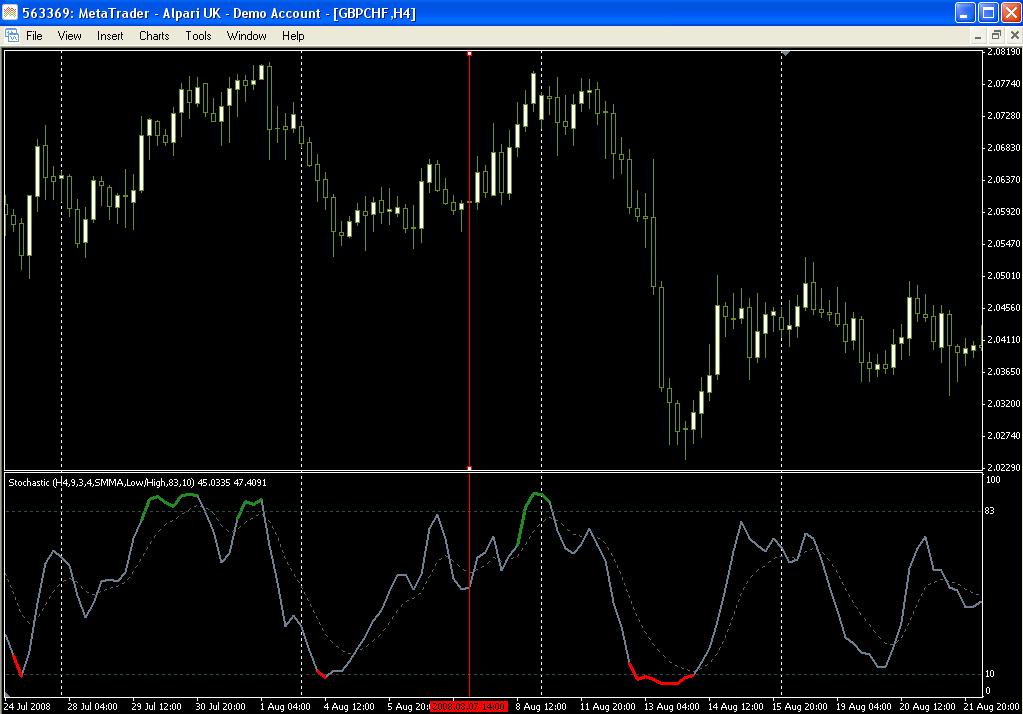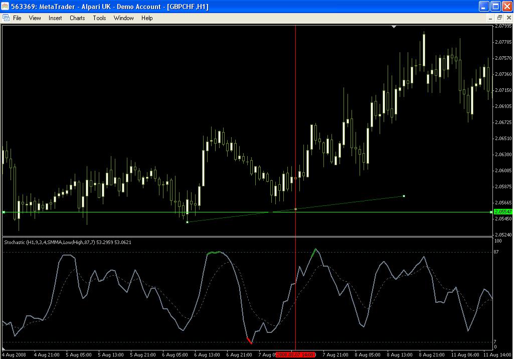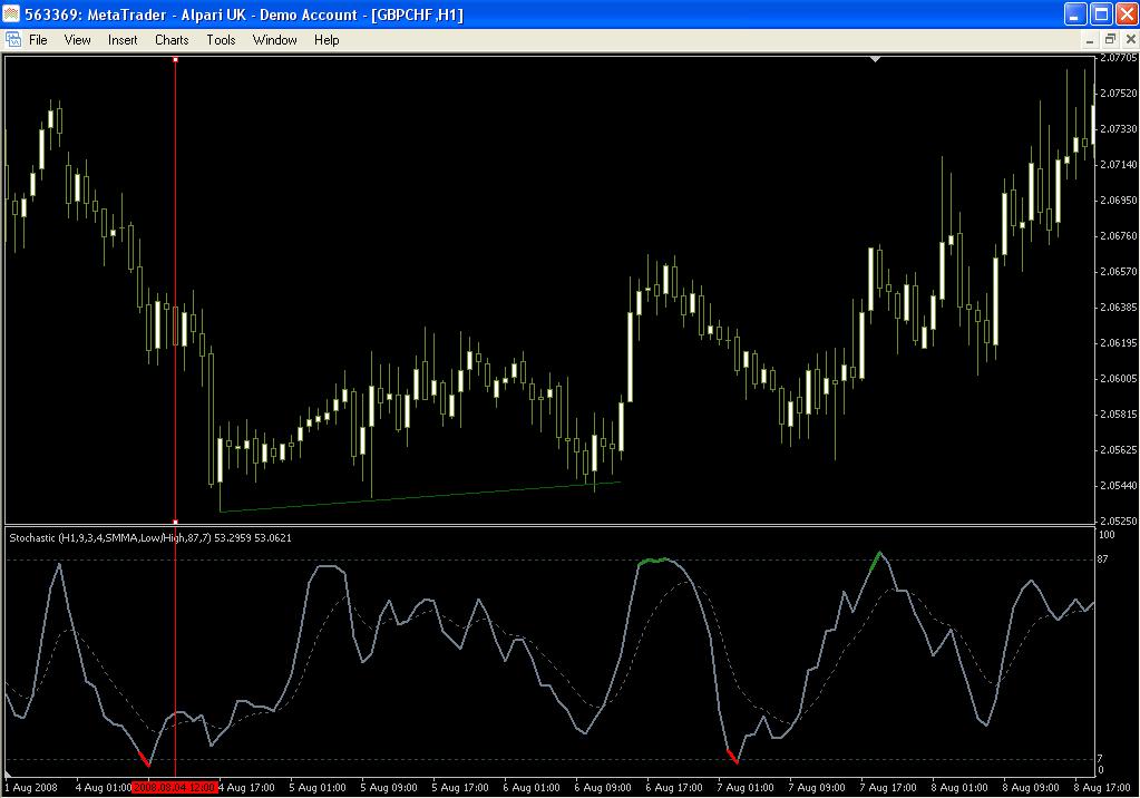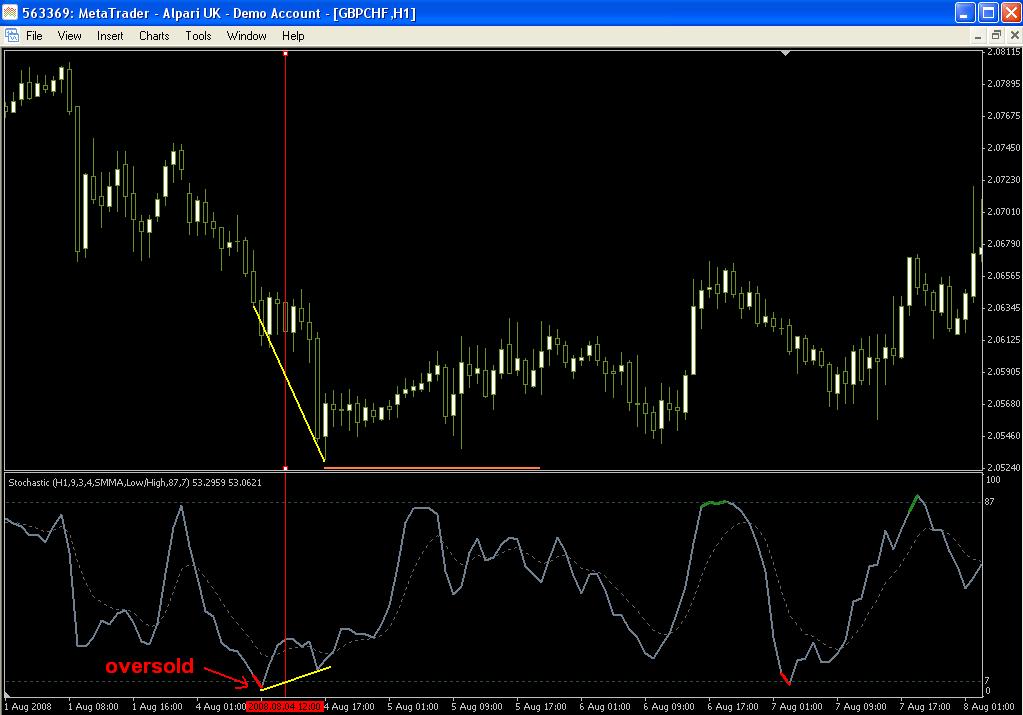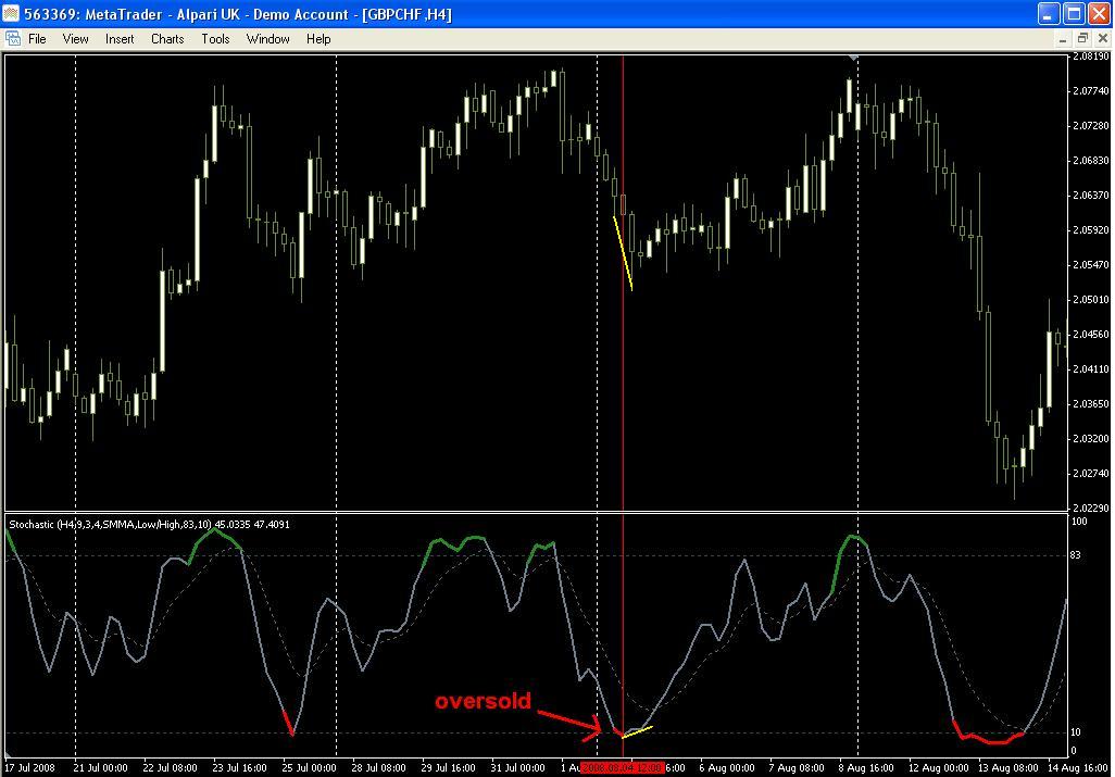 Observam in cazul de fata conditii oversold pe stochasticul avand configuratia 9,3,4. Asteptam ca stochasticul sa faca un HL (higher low) conform imaginii de mai jos.