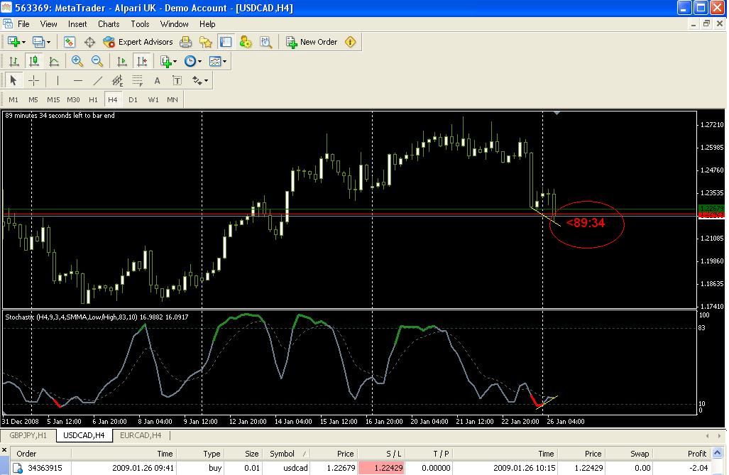 Stochasticul a trecut sub valoarea 7 si la fel asteptam ca oscilatorul sa faca HL (higher low) pentru a putea intra in long. Sl-va fi pus la 25 de pips sub valoarea minima a candelei bullish inchise corespunzand valorii HL de pe oscilator.