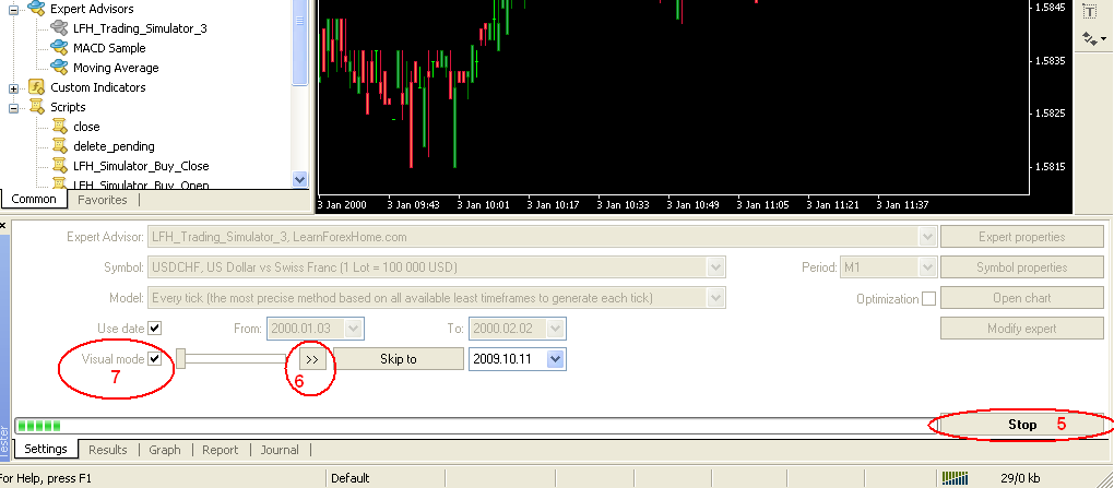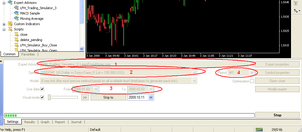 De acolo va selectati din lista expertul(1), perechea (2), data pe care faceti testing(3), timeframe-ul(4).