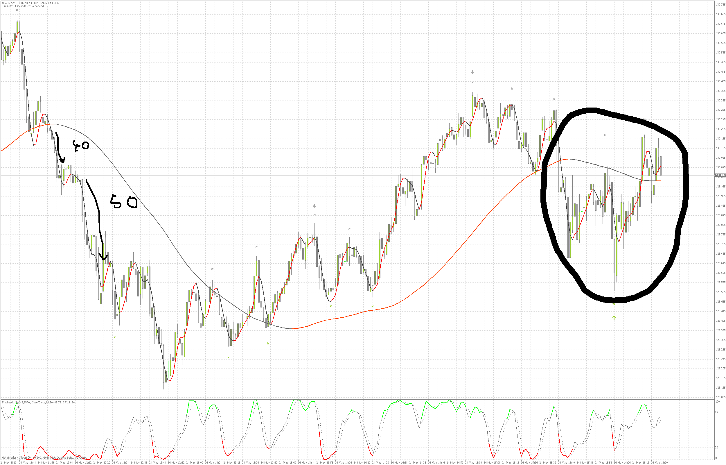 Folosesc sistemul format din 2 indicatoare Slope Direction unul de perioada 10 si metoda 3 si altul de perioada 100 si metoda 2. Cumpar si vand cand ambele indicatoare au aceeasi culoare pe Time Frame de 1M pe GBP/JPY. Totul functioneaza perfect pana cand apare zona de zgomot cum e la sfarsitul pozei. Stiti un indicator care miar putea arata cand pretul se misca smooth ? Sau o periada de timp cand este clar cine conduce piata ?