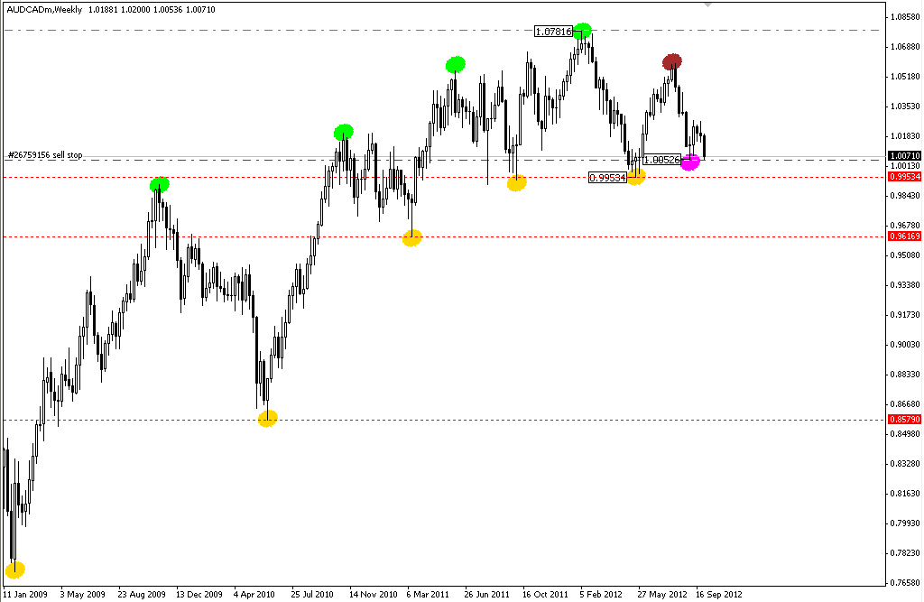 Raspuns nr.1: Baza de la 1.00526 este o baza minora, nu este asa de importanta ca si cea de la 0.99534 si eventualele coborare vor face ca acea baza sa fie sparta mult mai usor, fara rezistenta foarte puternica de pret, avand totodata un spatiu de management al tranzactiei, pana la urmatoarea baza care e foarte apropiata (aproximativ 95 pips, in comparatie cu cadrul de timp utilizat, cel saptamanal).