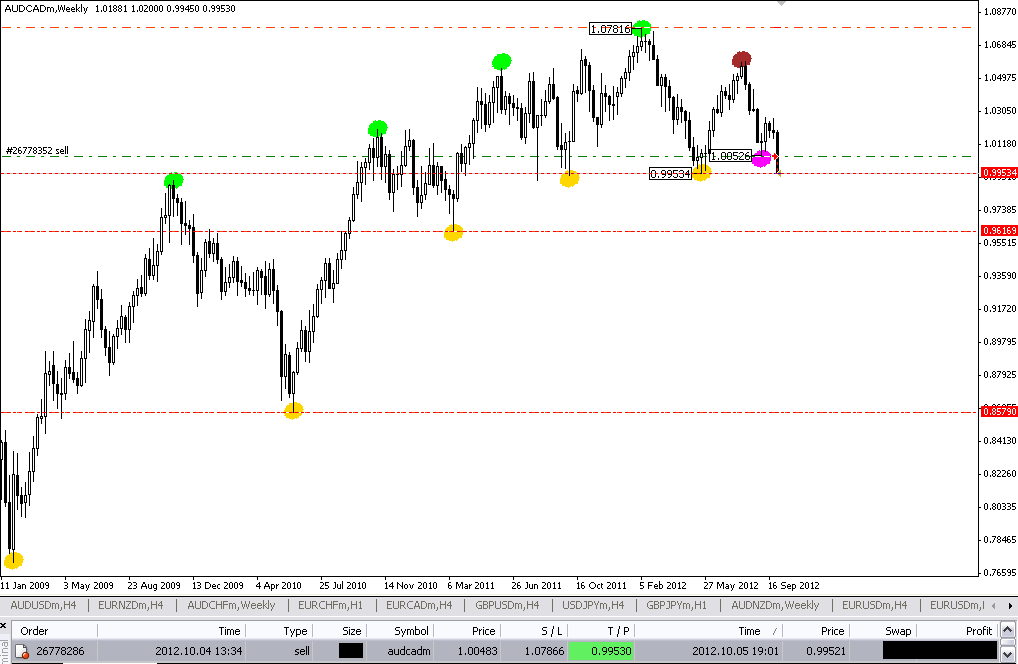 Tranzactia a decurs excelent, pretul a spart si ultimul minim saptamanal, cel de la 1.00526, mergand pana la un nou minim, la valoarea de 0.9945. La nivelul 0.99534, o treime din lotul initial a fost inchis pe profit (95.3 pips), restul ramanand sa se dezvolte pentru atingerea celorlalte tinte.