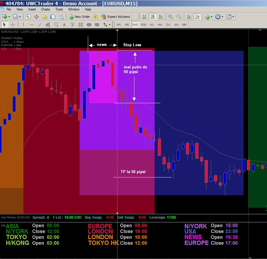 Sistemul pare simplu, se masoara cati pipsi a oscilat pretul in perioada 15:30-17:00 ora noastra pe graficul de 15M, daca este sub 50 pipsi punem un ordin de Buy in partea superioara si un ordin de Sell in partea inferioara cu SL la limita opusa.
