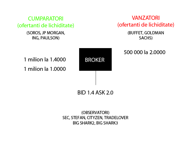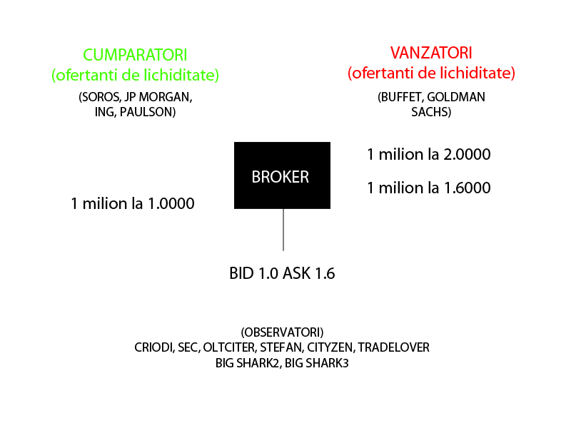 In acelasi mod puteti mai departe sa va imaginati orice fel de scenariu caci alte posibilitati nu mai sunt. Preturile de ask si bid sunt stabilite de ofertantii de lichiditate, iar brokerul face legatura intre participanti. In cazul in care tu ai destui bani cat sa ii acoperi ofertantului de lichiditate suma brokerul va va pune in legatura si va va executa tranzactia. In acest caz brokerul va face profit din comision. In cazul in care nu exista lichiditate pentru suma voastra brokerul va respinge ordinul. In cazul in care doi participanti pun doua ordine market in acelasi timp brokerul face legatura intre participanti si isi ia profit si din spread si din comision. (Vorbesc aici de brokerii ecn. Astia ori fac piata daca e nevoie ori te pun in legatura cu ofertantii de lichiditate. Pe ei nu ii intereseaza la ce pret executi tu ordinul. De-aia brokerii ecn te lasa sa pui un bid sau un ask la orice pret. Brokerii market maker nu te lasa sa pui ordine limit – adica sa oferi lichiditate – decat la o distanta minima de pretul de piata. Ei au nevoie sa mentina o distanta intre pretul de vanzare si pretul de cumparare pentru a face profit.)