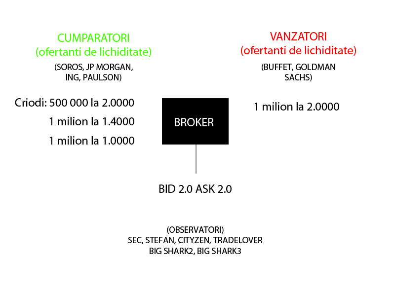 Sa ne imaginam insa ca in acelasi timp, CITYZEN arunca si el un ordin in piata de 500 de mii in directia opusa mie. Ce se intampla in cazul acesta? Brokerul ia ordinul meu si il imperecheaza cu cel al lui CITYZEN. In acest caz brokerul devine un market maker propriu zis. Daca pana acum in restul tranzactiilor pretul era facut de ofertantii de lichiditate, pretul in cazul tranzactiei noastre este stabilit de catre broker. Broker-ul in acest caz, ia ordinul meu long de 500 000 la 1.4 si i-l vinde lui CITYZEN la pretul de 2.0. Brokerul incaseaza un profit frumos din spread iar noi ne vedem cu tranzactia executata la pretul pietei.