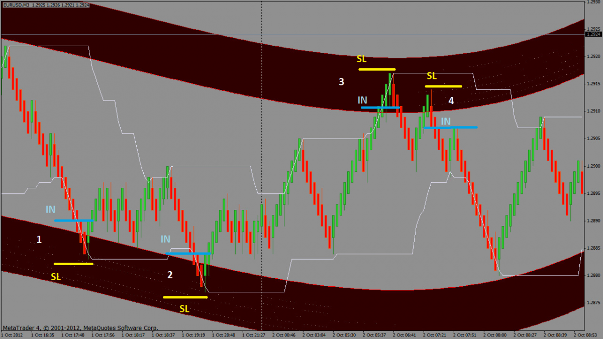 Astept ca pretul sa intre in dunga rosie si apoi sa se respinga de linia Donchian-ului.Daca pretul depaseste cu 1 pip prima bara formata dupa respingerea din linia Donchian-ului,intru in tranzactie.