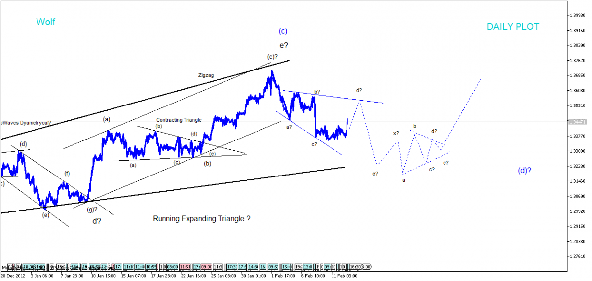Incepem analiza patternului care se formeaza in valul ( c ) si este presupus un impuls cu valul 1 extins . Daca urmarim valul 2 este mai mare in timp decat valul 1 a retras aprox 38.2% din el si apoi a fost o miscare care daca o masuram intern este la 81% fata de valul 1 dar extern fata de valul 1 este la aprox la 38.2% fata de el ceea ce inseamna ca respecta regula unui impuls cu valul 1 extins care spune ca valul 3 nu trebuie sa fie mai mare de 61.8% extern fata de valul 1 . Daca urmarim cu atentie in acesta zona a inceput o consolidare care ar putea sa fie presupusa valul 4 . Ce comportament asteptam ? Un val 4 mai mic in timp decat valul 2 si o miscare descendenta mica care nu ar trebui sa depaseasca 61.8% din valul 3 . Ceea ce ar inseama aprox 1.2777 depinde cum se va termina valul 4 . Imediat dupa aceasta miscarea ar trebui sa vedem o miscare contrara ascendenta .
