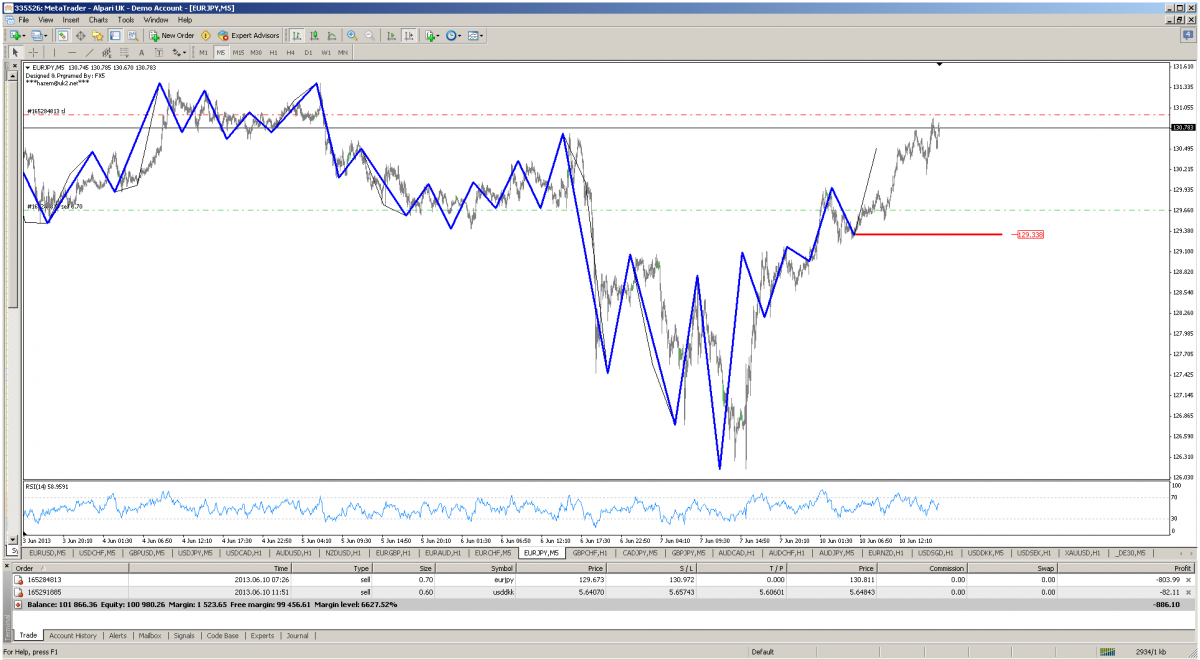 Pin bar in 05.06.2013, respingere in sus din pivotul de la 97.00 - asta pe grafic daily, iar pe H1 a trecut de suportul de la 99.