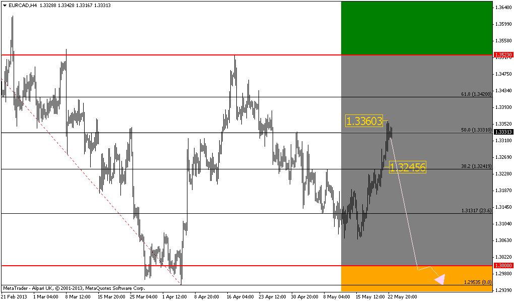 1. Continuarea miscarii crescatoare initiate din 15 mai 2013 si dat fiind miscarea, in comparatie cu coborarea de la valoarea de 1.35234-1.30666, vom astepta trecerea pretului de maximul de la valoarea 1.33603 si vom cumpara, tintind 1.3331 reprezentand nivelul de retragere de 61.8 al Fibonacci din intreaga miscare 1.35234-1.30666.