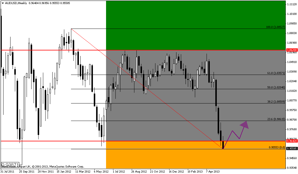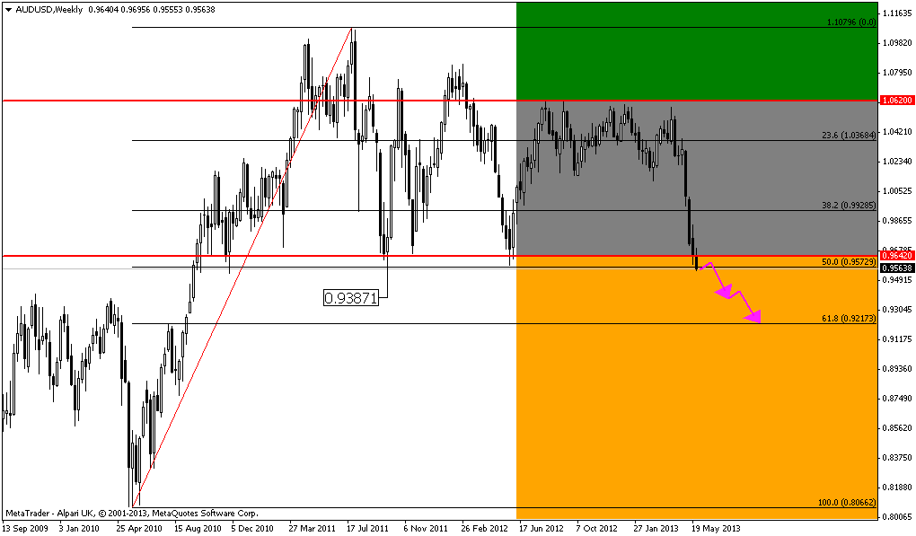 1. Confirmarea intrarii in zona de bias descrescator, prin inchiderea candelei saptamanale sub pivotul de la valoarea de 0.9642, avand ca principala tinta minimul anterior signifiant - 0.93871 iar, mai apoi 0.92173 reprezentand nivelul de retragere Fibonacci de 61.8 din miscarea crescatoare 0.80662-1.10796. De ce doar acest nivel si nu minimul de la 0.80662. Raspunsul este simplu - intreaga miscare descrescatoare de la valoarea 1.10796 s-a comportat pana acum ca o miscare corectiva si-atat. Foarte bine ar putea sparge pivotul de la valoarea 0.9642 si ar putea fi o spargere falsa cu coborari, terminate cu varfuri ascutite (n.a. eng. spike) sub forma unor formatiuni de stea de rasarit (n.a. eng. shooting star).