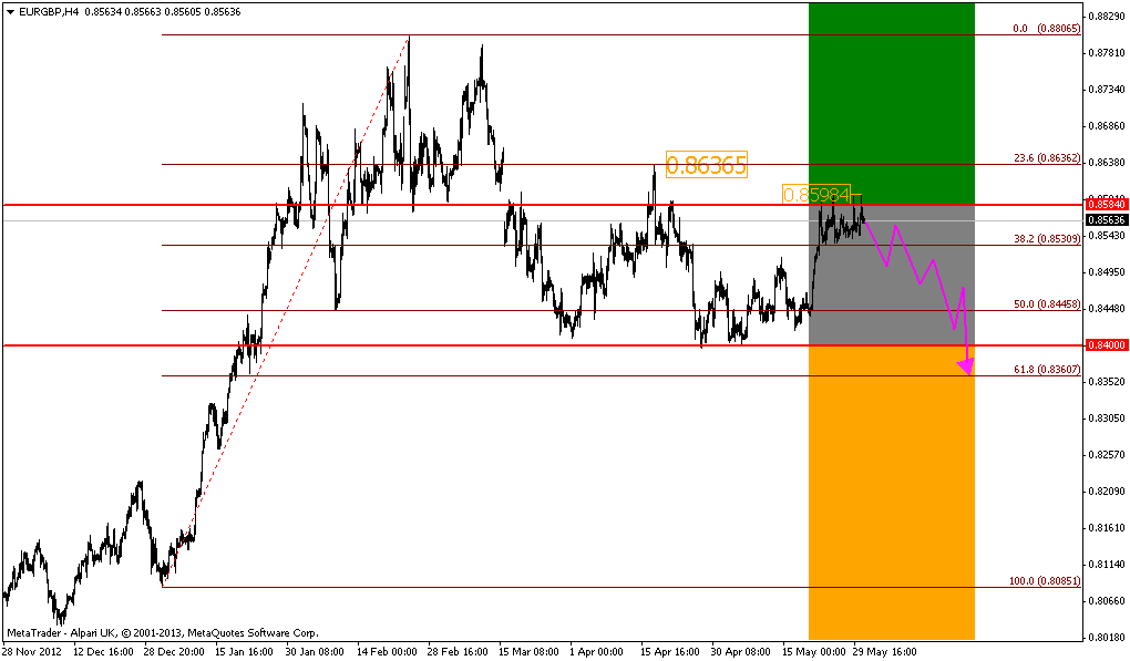 Perechea si-a continuat miscarea crescatoare trecand de pivotul 0.8584, pana la un maxim temporar de 0.85984. Pivotul a fost spart insa nu putem fi sigur de consistenta acestui lucru, - pretul a trecut iarasi in bias neutru. Avand aceste informatii vom stabili urmatoarele coordonate, dupa cum urmeaza: