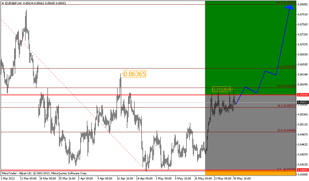 1. Perechea isi va continua miscarea crescatoare (cea inceputa de la minimul 0.83975) si va trece prin pivotul de la valoarea de 0.8584 inca o data. Pentru a confirma stationarea in zona de bias crescator, vom tranzactiona la adapostul sigurantei asteptand ca pretul sa treaca intai de maximul temporar de la 0.85984 si, mai apoi, de cel de la valoarea 0.86365 pentru a putea intra long.